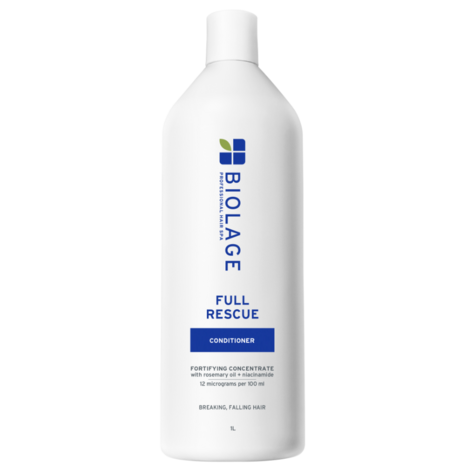Matrix Biolage Full Rescue balsam är utvecklat för vård av skört hår som är benäget att falla av. Formulan med rosmarinolja och niacinamid ger näring åt håret längs hela längden, stärker dess struktur och hjälper till att minska hårbrott och håravfall, även det som orsakas av mekanisk påverkan – som borstning eller styling. Rosmarinolja har antioxidanteffekt och stödjer hårbottens hälsa, medan niacinamid stärker rötterna och hjälper till att återställa hudens skyddsbarriär. Balsamet gör håret fylligare, slätare, glansigare och lättare att reda ut. Passar för försvagat och färgat hår.