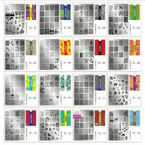 Nail art stamping plates with different designs.
