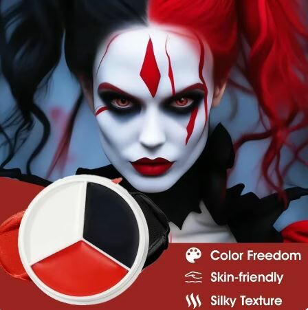 Meigipalett, sisaldab 3 värvi Professionaalne näokehavärv, punane/must/valge kreemjas näomeik, 12g Värv on valmistatud ohututest materjalidest, mittetoksiline, nahasõbralik ja kergesti puhastatav. Tekstuur muudab näovärvi kreemi pealekandmise lihtsaks. Seda saab peale kanda pintsliga või käsitsi. Halloweeni jumestamiseks. See sobib hästi halloweeni jumestuseks, professionaalsetele meigikunstnikele filmide ja televisiooni jao...